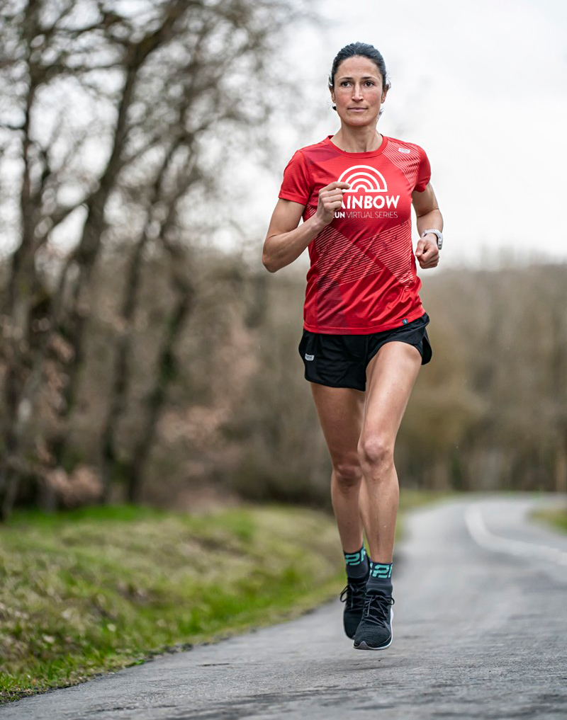 Camiseta técnica (modelo mujer) 100% reciclada de running realizada con el nuevo tejido técnico INFINI_TECH, elaborado con poliéster 100% reciclado. Consulta aquí el cuadro de tallas
