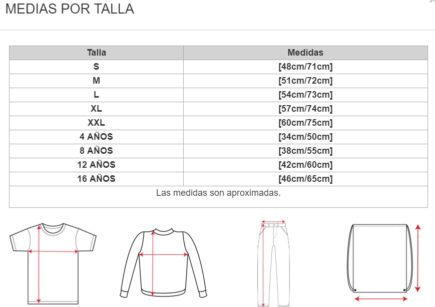 Adultos: S, M, L, XL, XXL Niños: 4 años, 8 años, 12 años, 16 años